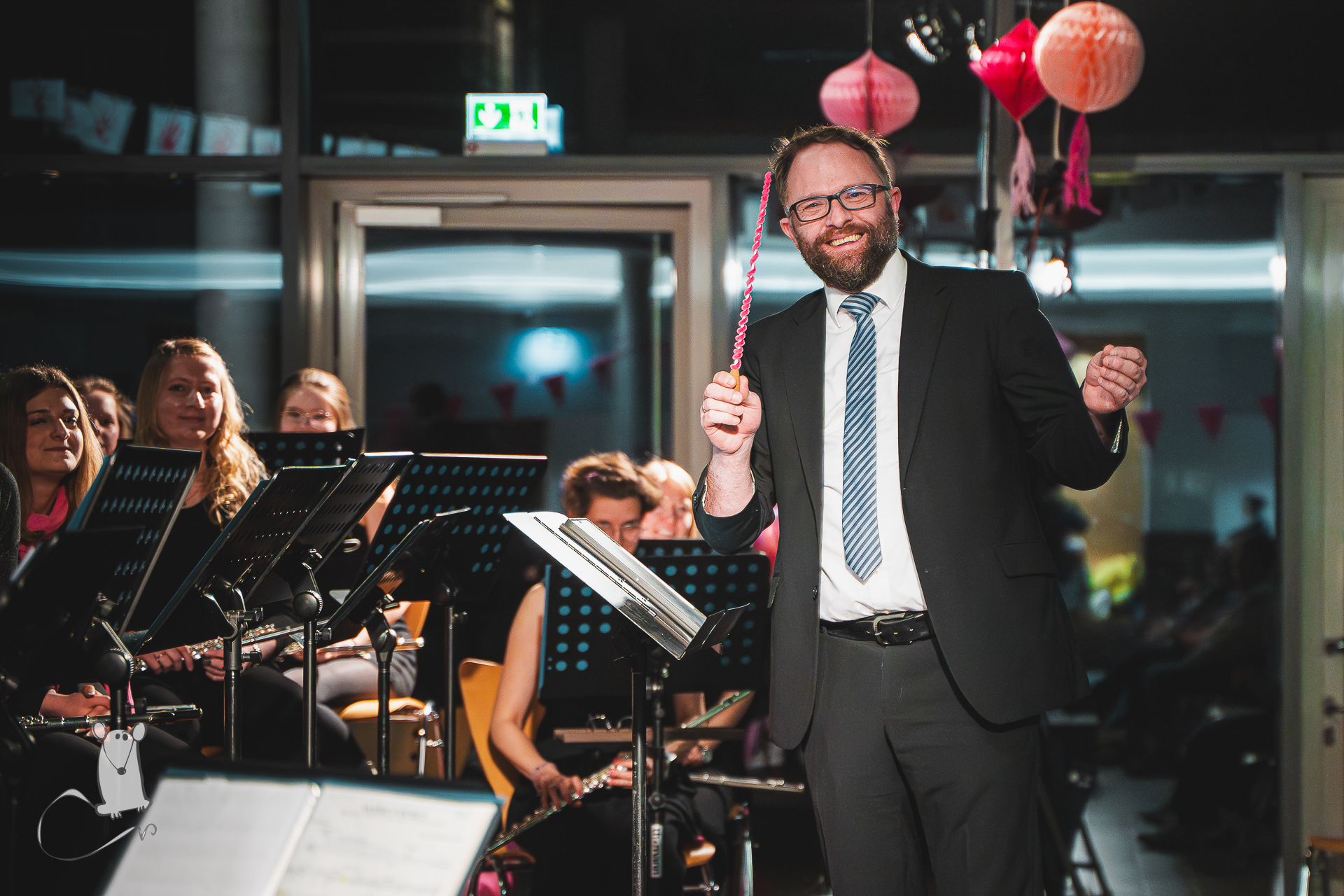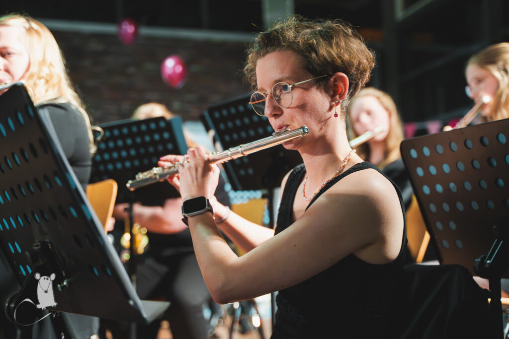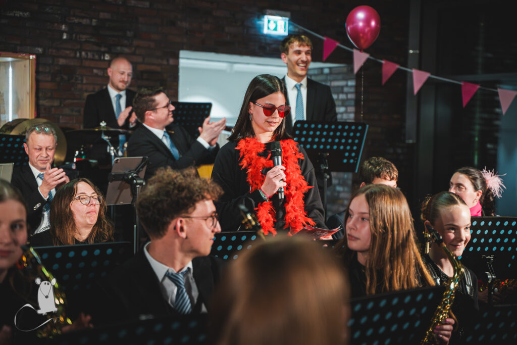 Schlagzeuger Julian führte das Publikum in einen der Lieblingstitel des Hauptorchesters ein. Da er in den 80ern noch nicht mal geplant gewesen sei, solle er eines der besten Jahrzehnte überhaupt verpasst haben, berichtete der 15-jährige. „Angeblich liefen diese Hits damals auf sogenannten Kassetten. Die man mit dem Bleistift zurückdrehen musste,“ das sei doch zu unpraktisch, meinte er. „Da könne man doch besser dem Musikverein zuhören!“ Die 80er Kult-Tour war nur eins von zwölf Stücken auf der Setlist, die unter Leitung von Niko Förster präsentiert wurden. Auf den festlichen Konzertmarsch Washington-Post folgte die Ode an die Freude in einem Arrangement von Albert Loritz. Weiter ging es mit dem Musical-Hit „Jesus Christ Superstar“, an den sich Jacob de Haans „La Storia“ anschloss. Noch vor der Pause präsentierten die Oyther mit dem „Pink Panther Theme“ einen weiteren Grund, warum das Frühjahrskonzert auffällig Pink gestaltet war.